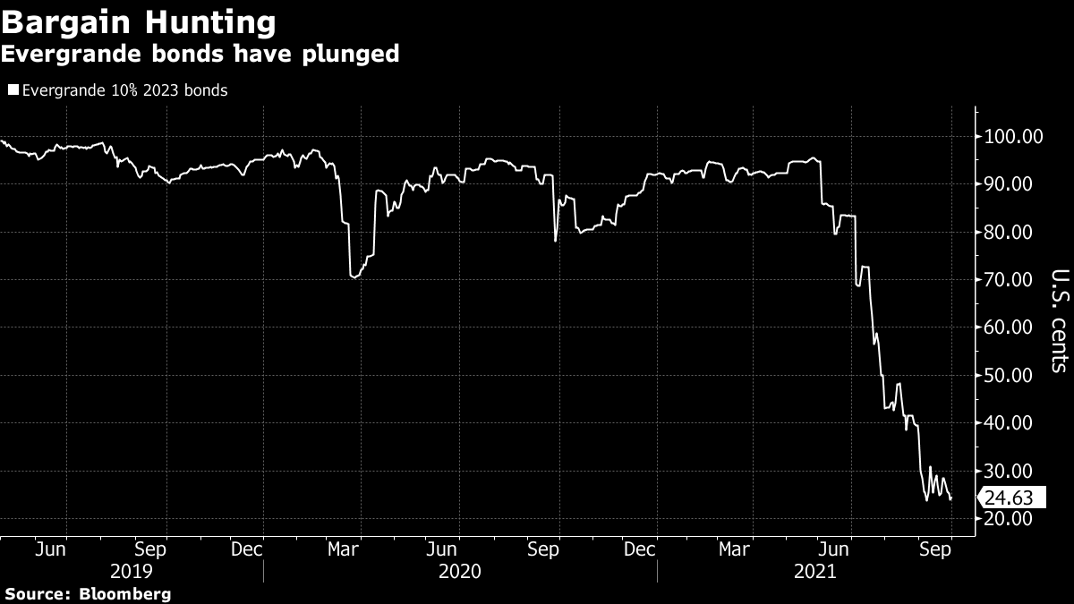 “低价”可能是轻描淡写了。到2023年到期的恒大10%债券在周三引领了美国高收益债市的下跌,跌幅为2.375美分,跌至每美元23.875美分 -- 创下历史新低。鉴于恒大是亚洲最大的高收益票据发行者,涟漪效应是巨大的 -- 该地区垃圾债券指数的收益率飙升至超过14%,达到近十年来的最高水平。
