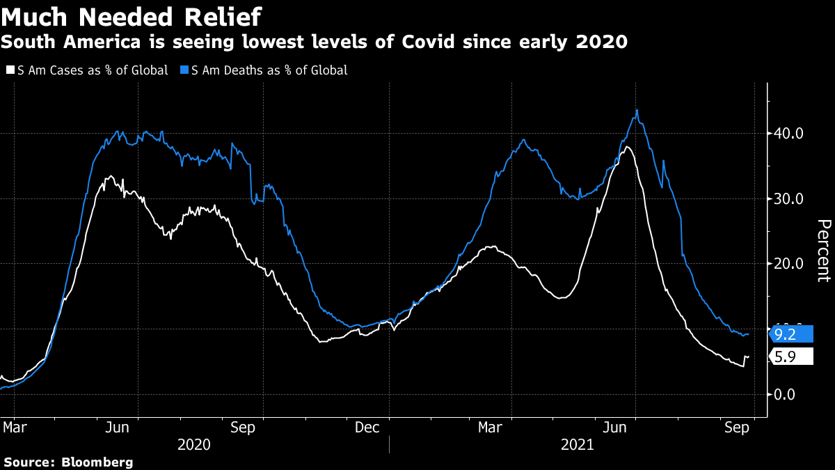 虽然该地区的疫苗接种活动开始较晚,并且仍然面临供应短缺问题,但在过去几个月里各国加快了步伐。智利和乌拉圭已经接种了将近75%的人口,而十个主要国家中有六个国家至少给超过50%的人口注射了第一剂疫苗。在巴西的大城市圣保罗和里约热内卢,约99%的成年人已至少接种了第一剂疫苗。