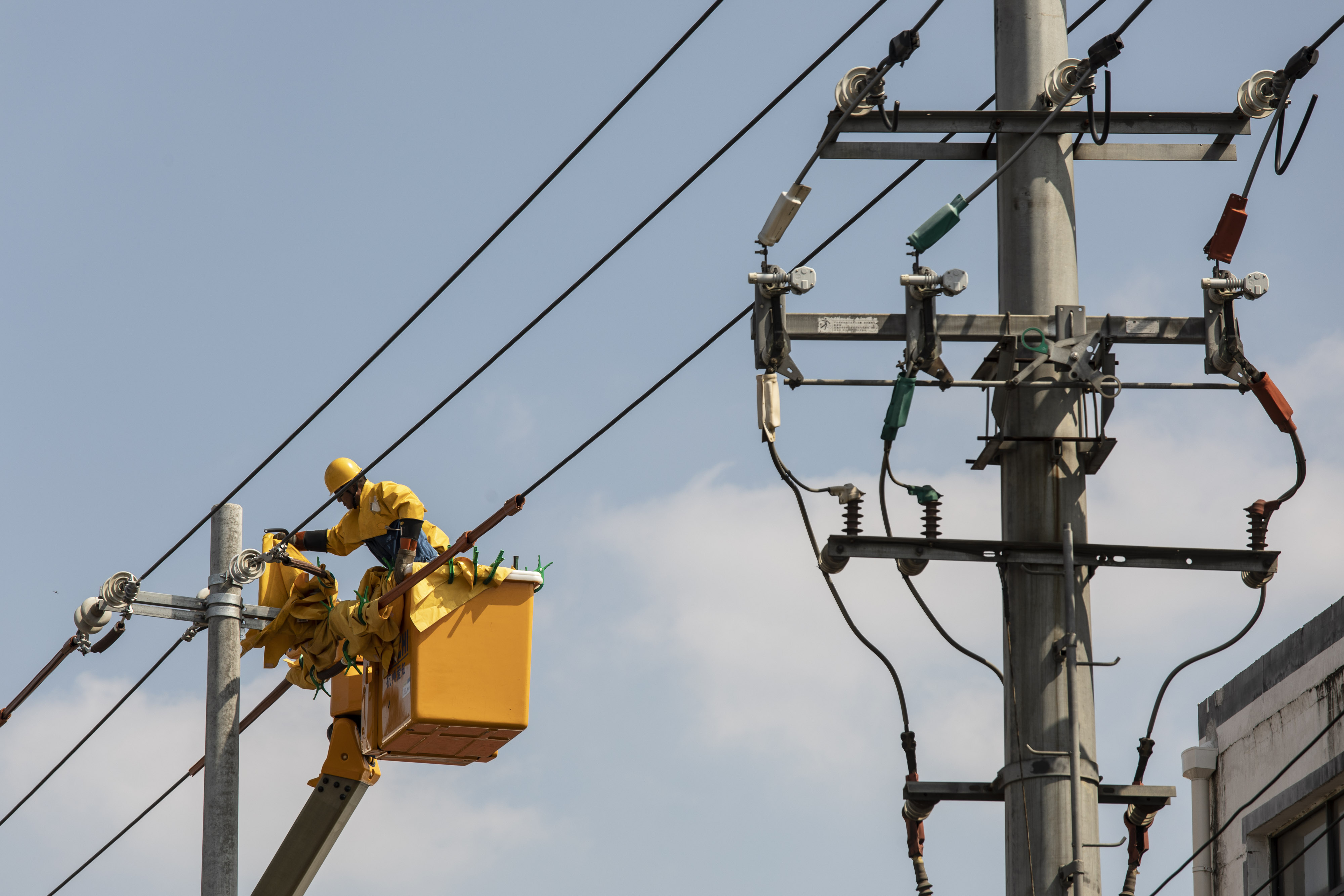 技术人员在中国江苏省于9月30日安装新的电力线路。
