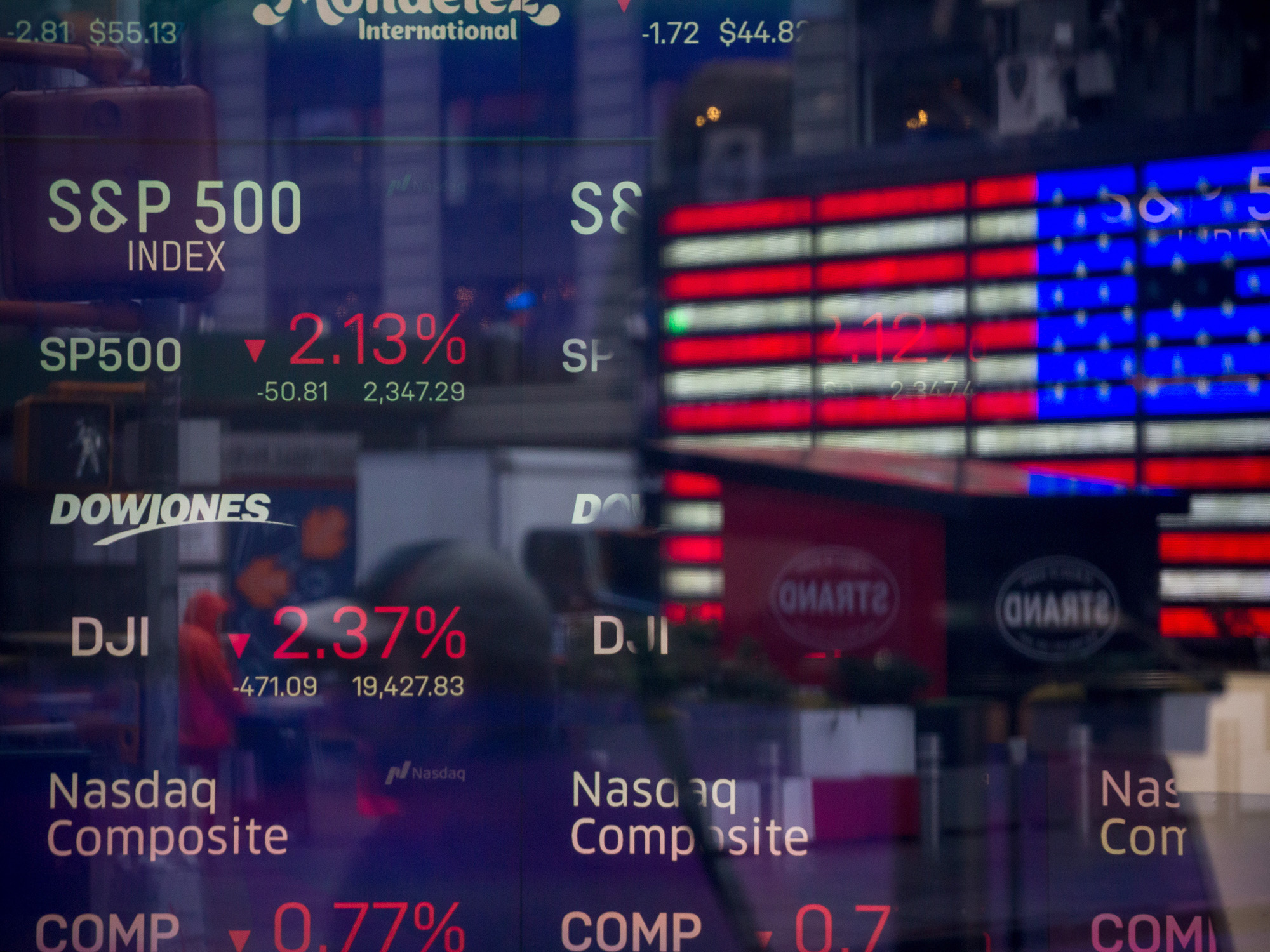显示股市信息的监视器透过纳斯达克市场的窗户可见。