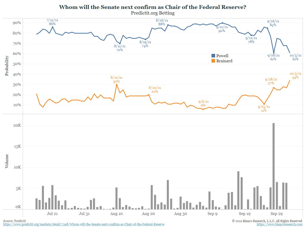 最近几天在联邦储备局主席鲍威尔获得总统乔·拜登提名连任的押注上发生了这样的情况。在PredictIt.org上,鲍威尔获得连任的合约从上个月的90%下跌至61%PredictIt.org,该网站允许用户通过购买未来事件的股份来进行押注。