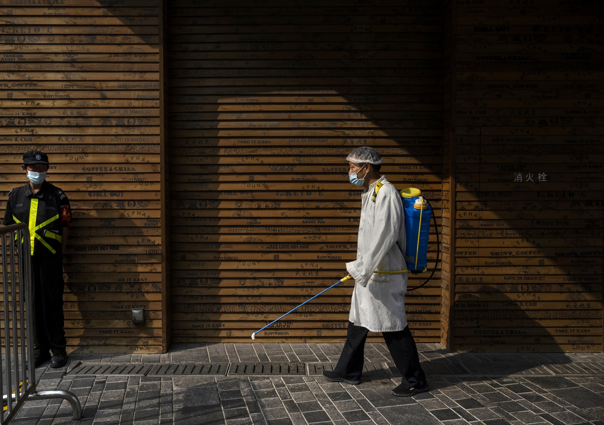 一名工作人员在北京的购物区进行常规消毒以预防新冠病毒。摄影师:凯文·弗雷尔/盖蒂图片亚太### 你应该阅读的内容