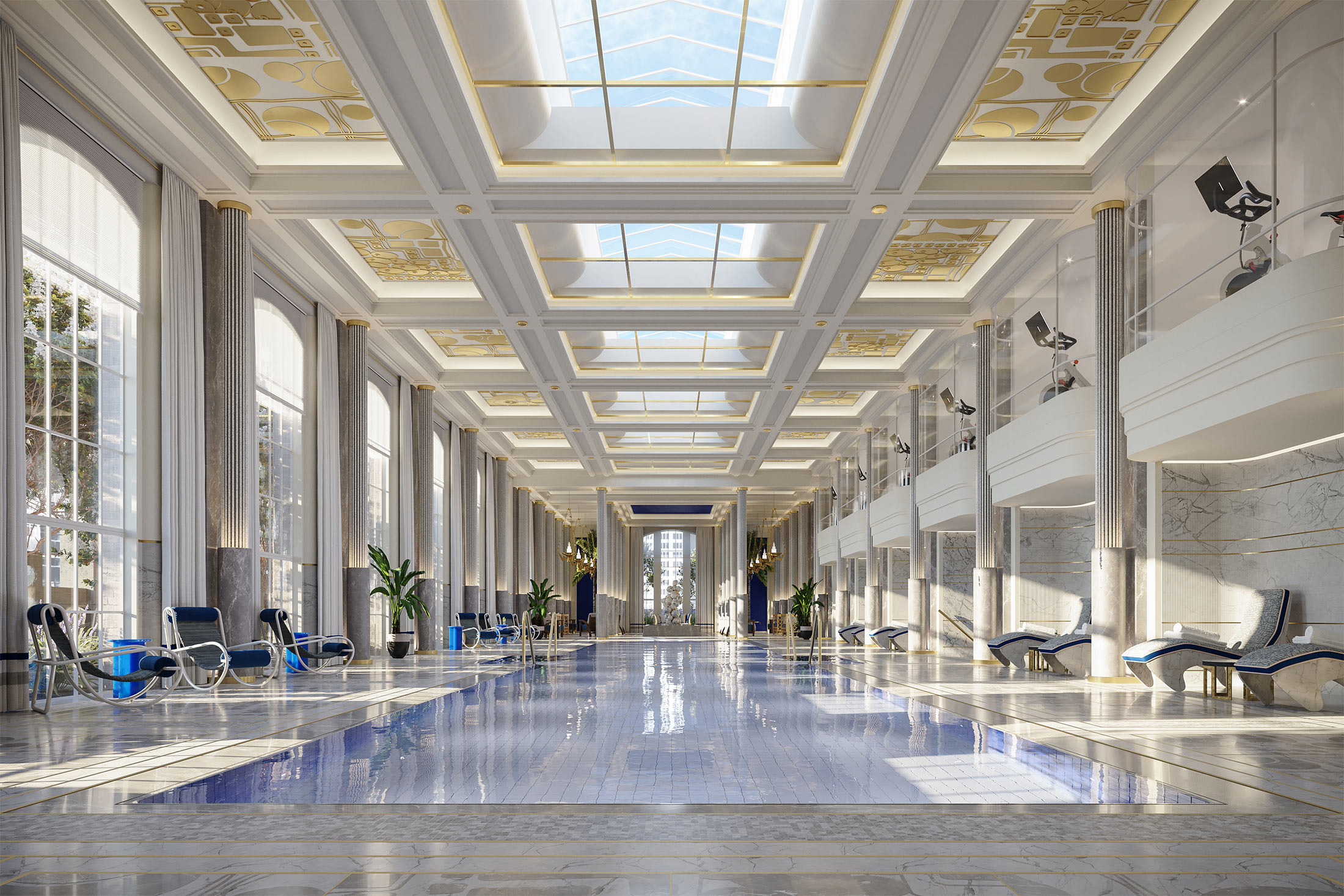25楼的天窗泳池效果图。来源:华尔道夫酒店其中一位购房者是罗斯玛丽·多萝西·布里亚-莱文。63岁的布里亚-莱文是一名医生,以180万美元购买了一间工作室。她表示,她被专属于居民的设施所吸引,如私人水疗中心、现场表演舞台和25楼的天窗泳池。她对2018年吴某被捕或者美国总统访问纽约时选择其他住所可能带来的声誉损失并不担心(在中国接管后,奥巴马总统跳过了传统的华尔道夫酒店住宿,选择了纽约皇宫酒店)。