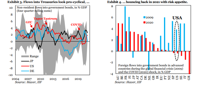 - 一些人对这一论点提出了异议,指出今年外国资金流入美国国债。根据国际金融协会的专家们的说法,今年资金流入的增加只是对2020年资金流出的回报。