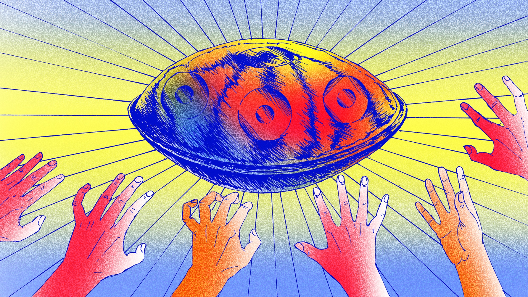 插图:Panayiotis Terzis然而,在这种乐器的崛起背后,却发生了一段痛苦的传奇。一旦手鼓在互联网上走红,仿冒品和外观相似品纷纷涌现。这一过程变得更加极端,因为原版乐器几乎无法获得。每一把手鼓都是由一对隐居的瑞士艺术家Felix Rohner和Sabina Schärer手工制作的,他们使用一种如此谨慎、费力和缓慢的过程,以至于多年来供应一直远远低于需求。在瑞士家中通过Zoom进行的一次罕见采访中,这两位艺术家充满激情和理想主义,认真地谈论“锤子的精神”和他们手工艺的纯洁性。他们对自己作品的广泛商业化也感到愤怒。