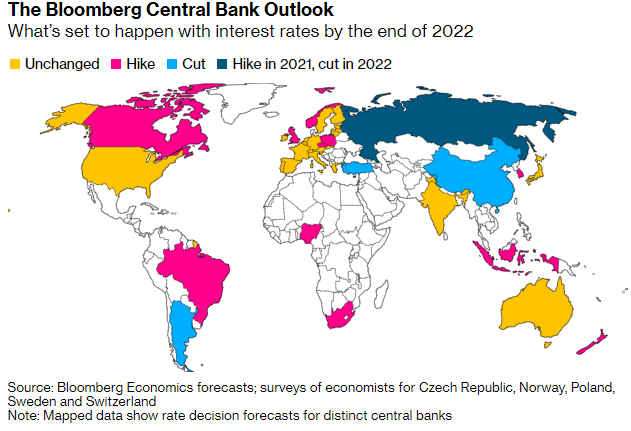全球许多央行开始撤回他们为了抵御去年的大流行衰退而推出的紧急刺激措施。随着通胀加速,美联储计划放缓其资产购买计划,而挪威、巴西、墨西哥、韩国和新西兰的同行已经提高了利率。然而,欧洲央行和日本银行等官员打算继续积极刺激其经济。IMF预测,至少在发达经济体中,通胀很快将降至约2%。