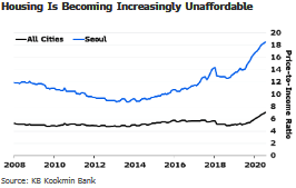 尽管文在寅政府采取了许多措施来降低房价,但过去五年全国范围内的公寓价格已经上涨了超过70%。这显然已经引起了央行的关注 — 尽管周二没有连续第二次加息,但由于房价快速上涨、通胀压力和复苏势头,央行暗示未来可能会有进一步的举措。