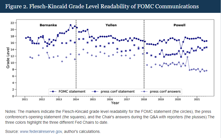 回到本·伯南克任期末期——普林斯顿大学经济学院的前院长——虽然他的问答并不那么困难,但在美联储政策声明方面,那些得分“阅读等级为20到21,相当于至少博士学位水平。”
