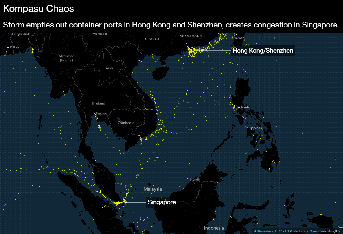 货船位置截至10月14日,以黄色热图显示。*一场热带风暴袭击中国南部,加上与Covid相关的供应链混乱,导致从深圳到新加坡的航运积压,加剧了人们担心圣诞节时零售货架可能看起来相当空荡的恐惧。*芯片政治 | 台湾积体电路制造股份有限公司表示,将在日本建造一家专门芯片工厂,并计划于2024年底开始在那里生产,这对于该国来说是一个战略性重要的步骤,因为芯片短缺问题长期存在。这也发生在日本更公开地支持台湾的同时,台湾是一个民主治理的岛屿,中国视其为一个省,这可能引发北京方面的新批评。