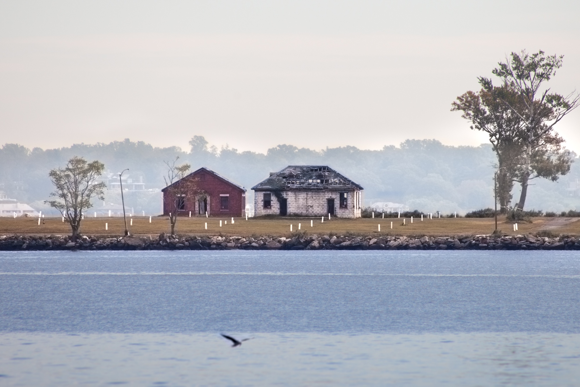 哈特岛,从纽约的城市岛看过去。每个标记代表大约150个成人坟墓。
