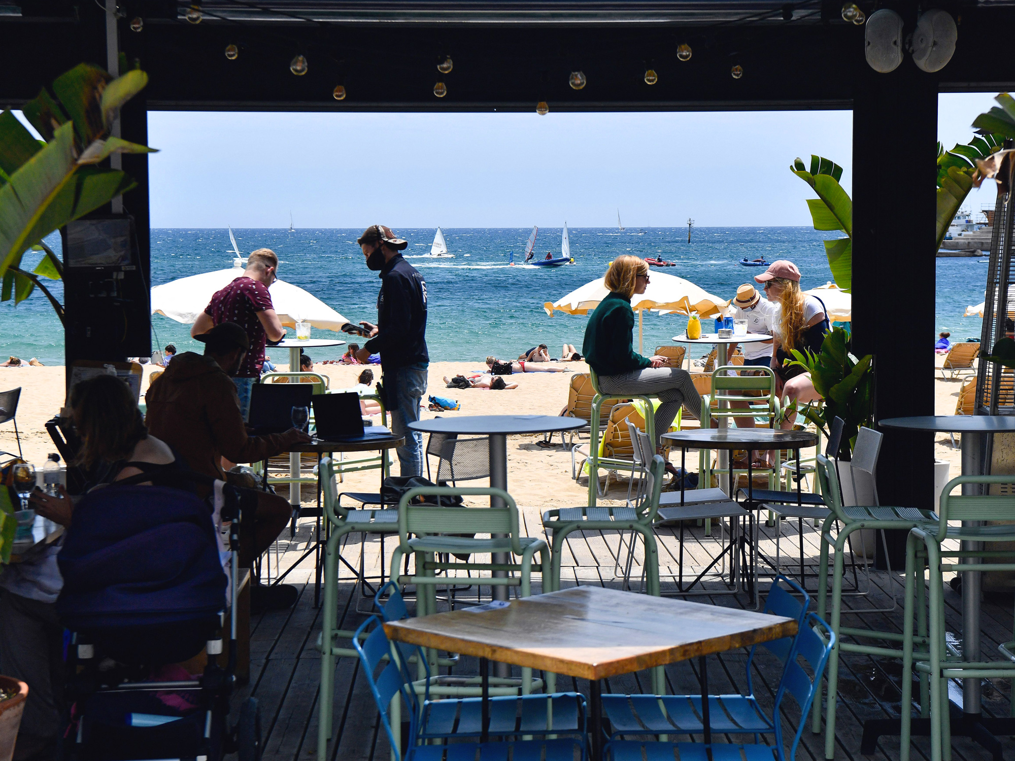 人们坐在巴塞罗那的波加特尔海滩的露台酒吧里。摄影师:PAU BARRENA/AFP### 您应该阅读的内容