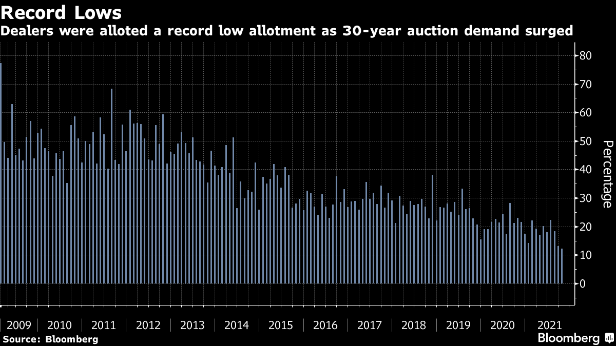 30年期债券的发行是真正的焦点--主要经销商(有义务竞标)被分配到了创纪录的低份额,而间接竞标者(据信包括外国央行)占据了惊人的70.5%份额。10年期销售的需求同样强劲,经销商被分配到了该期限有史以来的第二小份额。