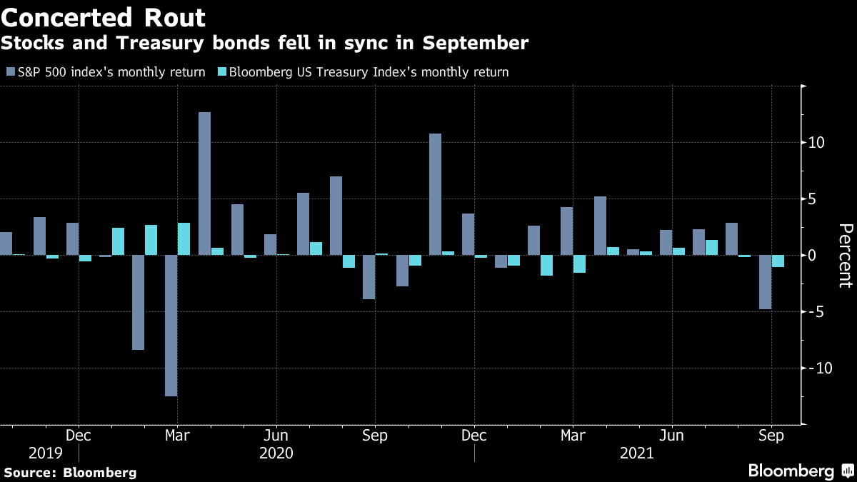 公平地说,情况确实变得棘手起来。彭博模型追踪的一揽子投资组合中,60%的股票和40%的固定收益证券在9月份下跌了超过3%,这是自2020年3月以来的最大月度跌幅。