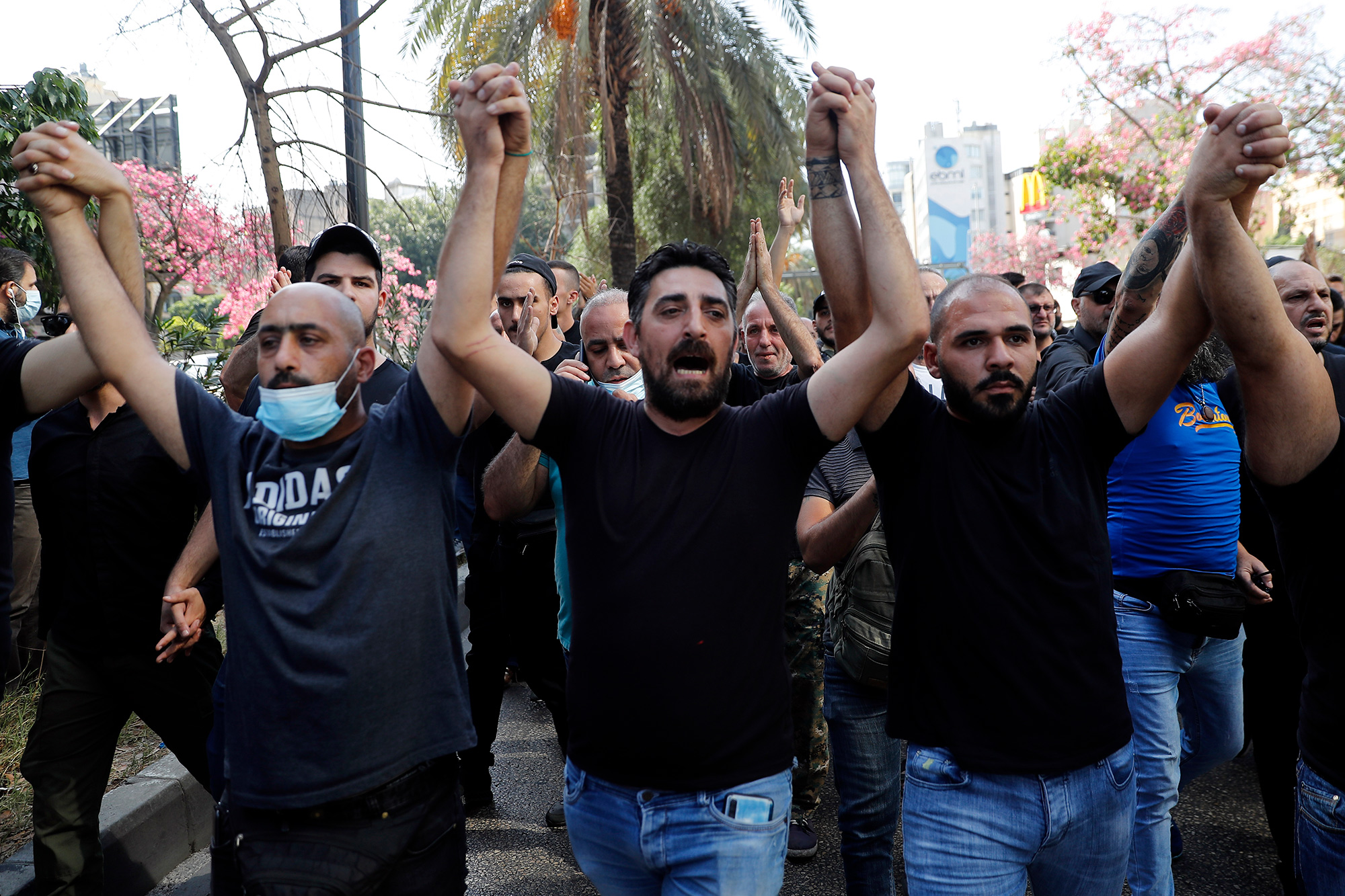 真主党和安马勒组织的支持者在贝鲁特司法宫前举行抗议活动。摄影师:Hussein Malla/AP在贝鲁特,真主党武装分子与他们的对手之间发生了武装冲突,造成六人死亡,至少30人受伤,这是针对调查去年在该市港口发生的致命爆炸的抗议活动。目前尚不清楚是谁或什么引发了枪击事件。