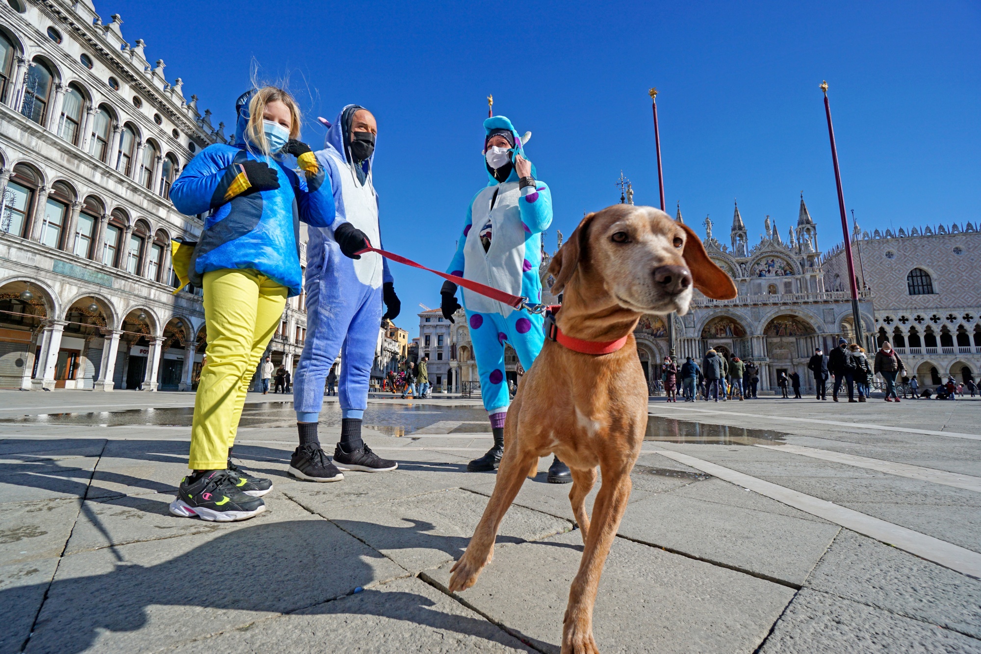 一家人穿着花里胡哨的服装在意大利威尼斯的圣马可广场遛狗,时间是2021年2月13日星期六。