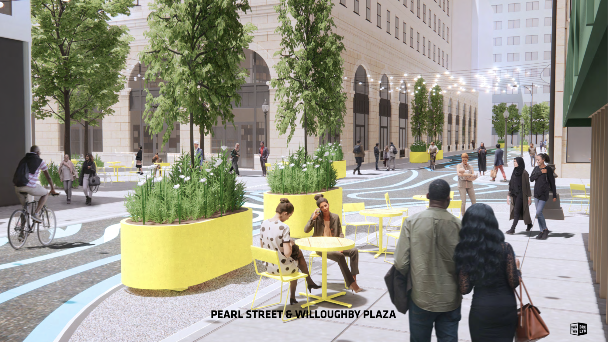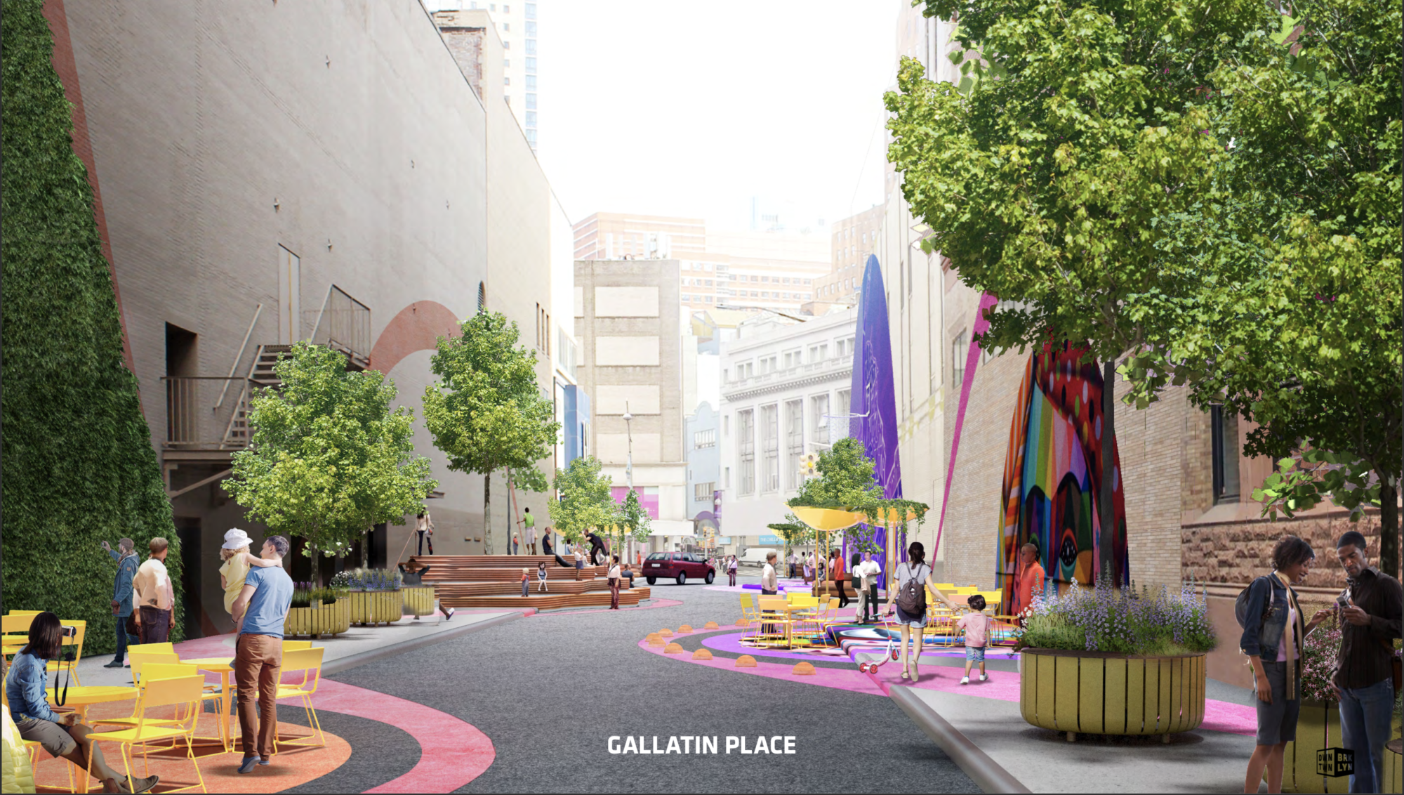 一幅描绘布鲁克林加拉廷广场变身为荷兰风格共享街道的效果图。效果图由Downtown Brooklyn Partnership提供这项计划是一系列城市商业区在疫情后尝试重新规划街道空间的最新尝试。仅在纽约市,SoHo Broadway Initiative BID提出了一项提议,试图将曼哈顿历史悠久的社区大部分区域改造为步行街,以吸引购物者。附近,Flatiron/23rd Street Partnership和the Meatpacking Business Improvement District (BID)也在朝着类似的方向发展。