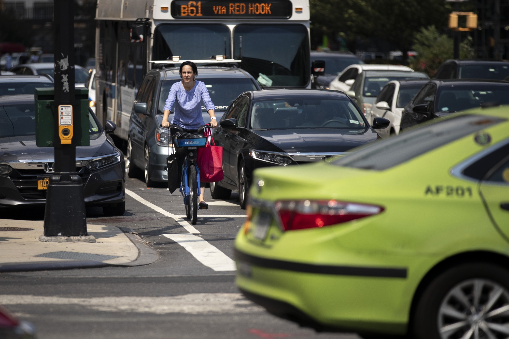 2019年,一名骑自行车的人在布鲁克林市中心争夺空间。最近几个月,交通量已经大幅增加。摄影师:Drew Angerer/Getty Images North America有理由相信这种情况可能会发生。在8月下旬,杰街上出现了一条公交专用道,这是该市在近年来努力重新激活其“更好的公交车计划”的一部分,因为公交车速度近年来急剧下降。尽管这一路段比原始计划缩短了,但它直接穿过布鲁克林市中心,这里是许多公交线路的交汇点。纽约大都会运输署还宣布,城市范围内的公交网络重新设计将在今年秋季恢复,这是在新冠疫情期间暂停后的第一次。(首个接受重新设计的区域布朗克斯将在明年夏天完成。)