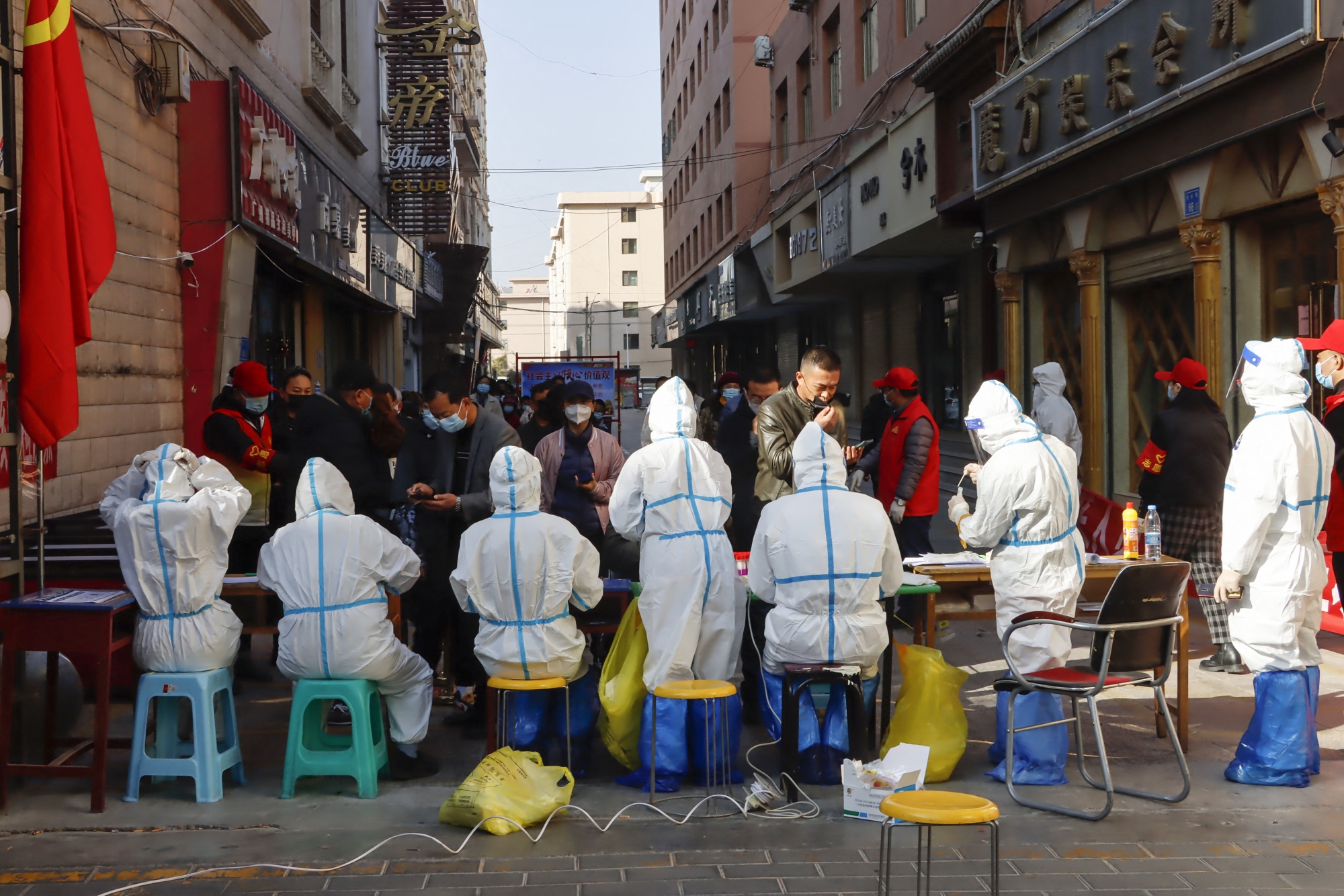 医护人员在中国张掖为新冠病毒进行核酸检测,日期为10月23日。