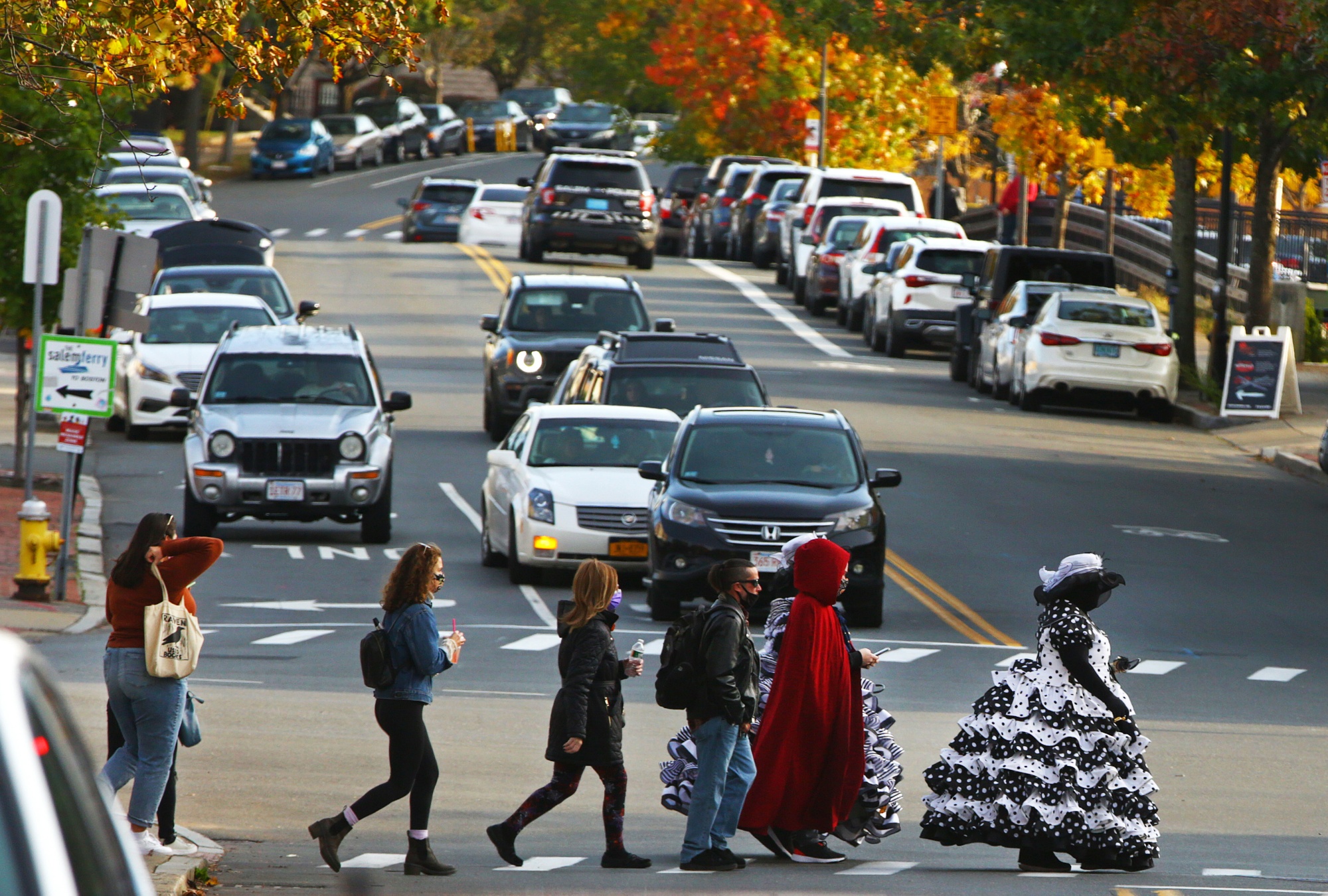 万圣节2020年,马萨诸塞州塞勒姆的一群不给糖就捣蛋的孩子们穿过街道。