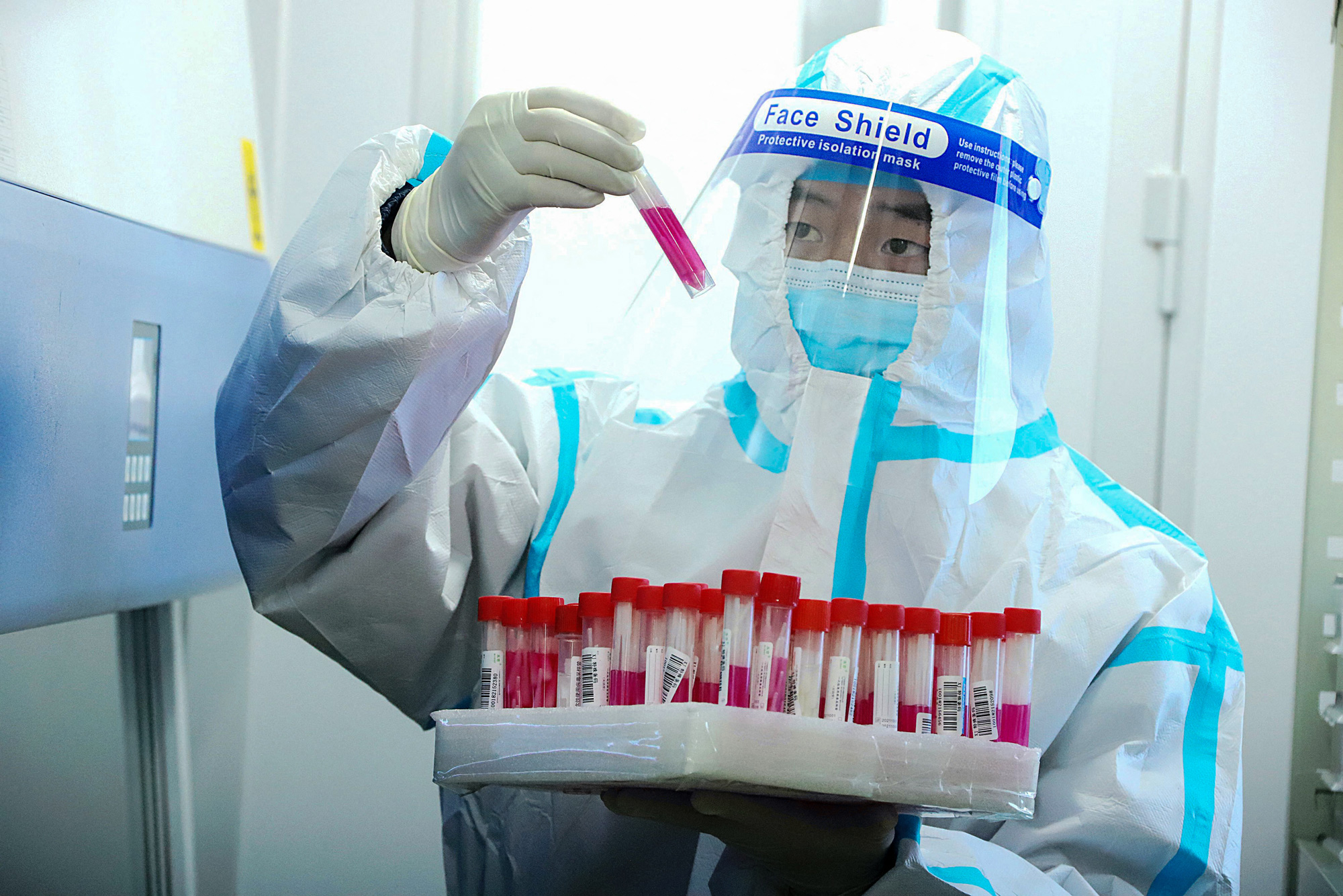 在中国西北部甘肃省张掖的一家临时新冠病毒检测设施的实验室技术员。