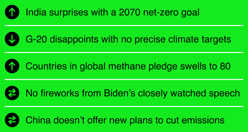 G20气候谈判的结果没有超出任何人的预期。但这并不是感到悲观的理由,David Fickling写道。在这些会议上几乎不可避免会感到失望。更重要的是全球朝着脱碳的强劲趋势。Mihir Sharma解释印度愿意减少煤炭使用,但需要资金。Andy Mukherjee和Anjani Trivedi解释说,两位碳燃料亿万富翁之间的竞争可能开辟一条通往低排放经济增长的道路,但每位商人只控制着某些拼图。