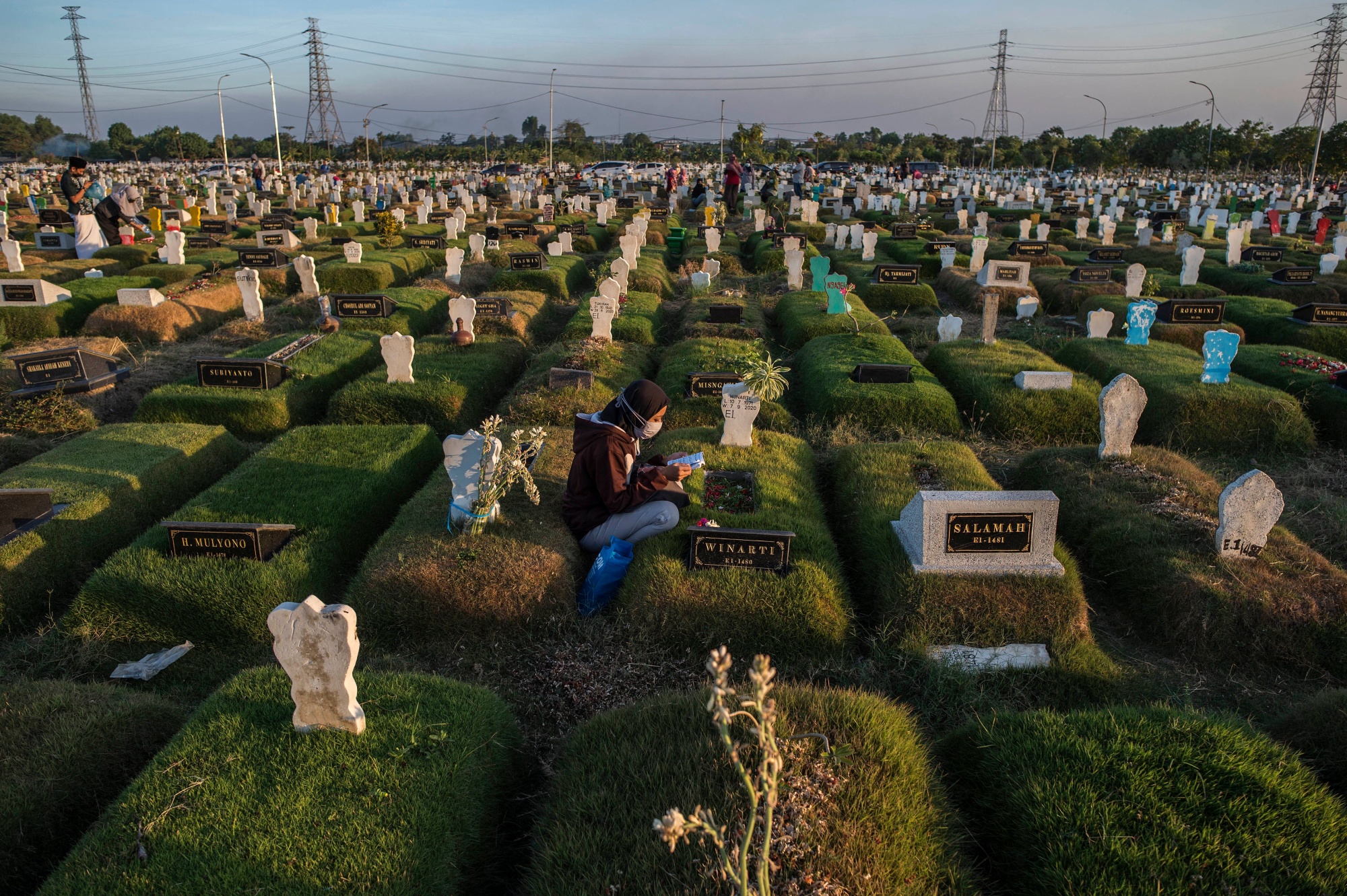 家人们在印尼泗水的一个墓地为一位死于冠状病毒的亲戚祈祷,日期为8月26日。