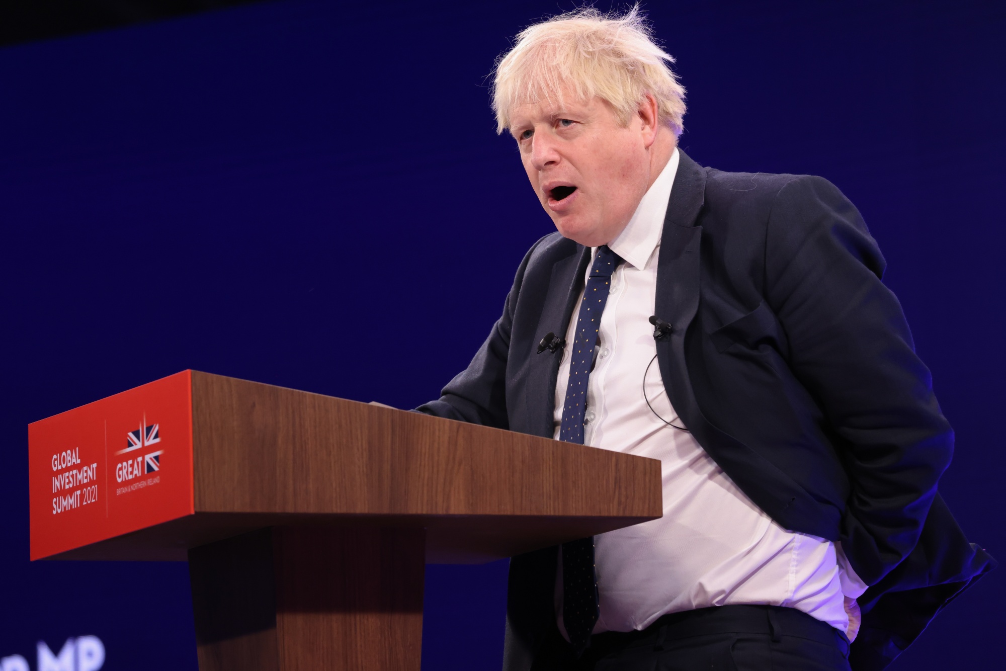 英国首相鲍里斯·约翰逊在2021年10月19日全球投资峰会上发表开幕词。