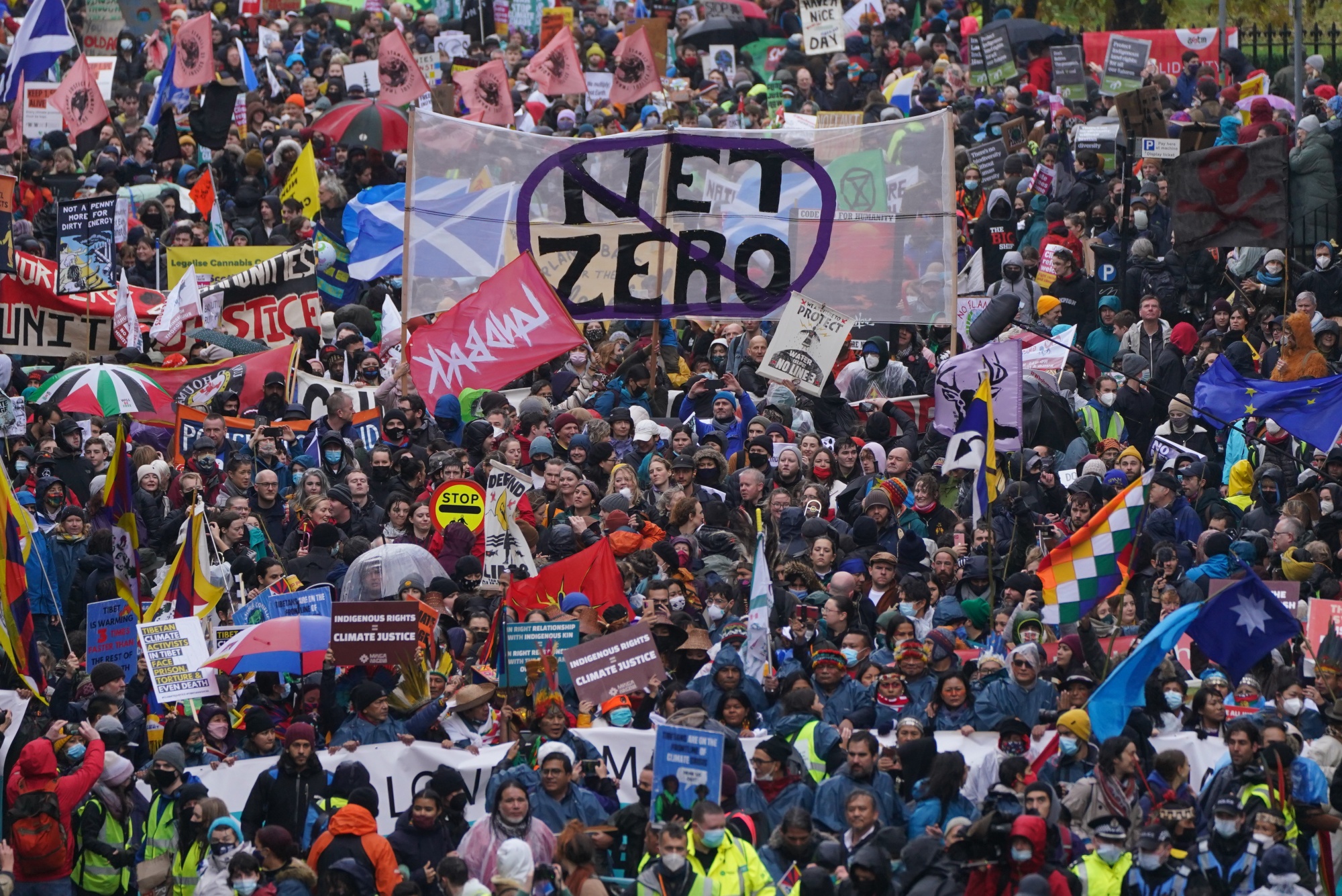 抗议者还强调了更多气候正义的需求,高呼口号如“停止绿色洗白,停止白色洗白”,以及“改变体制,而非气候变化。” 瑞典激进分子格雷塔·桑伯格也是示威者之一,她早些时候称COP26为“全球北方的绿色洗白节日。”