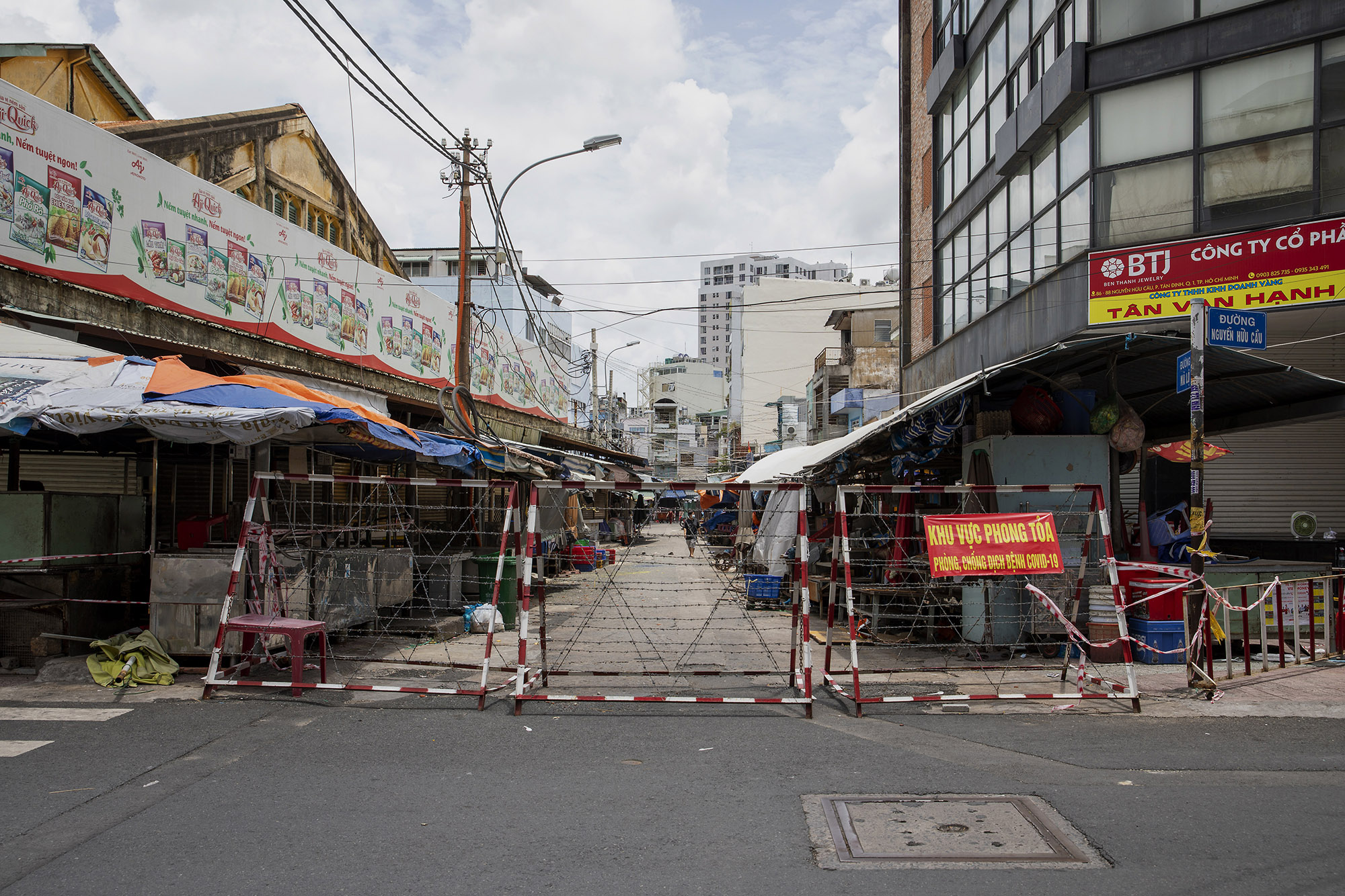 路障挡住了越南胡志明市的一个街头市场,在居家令下。