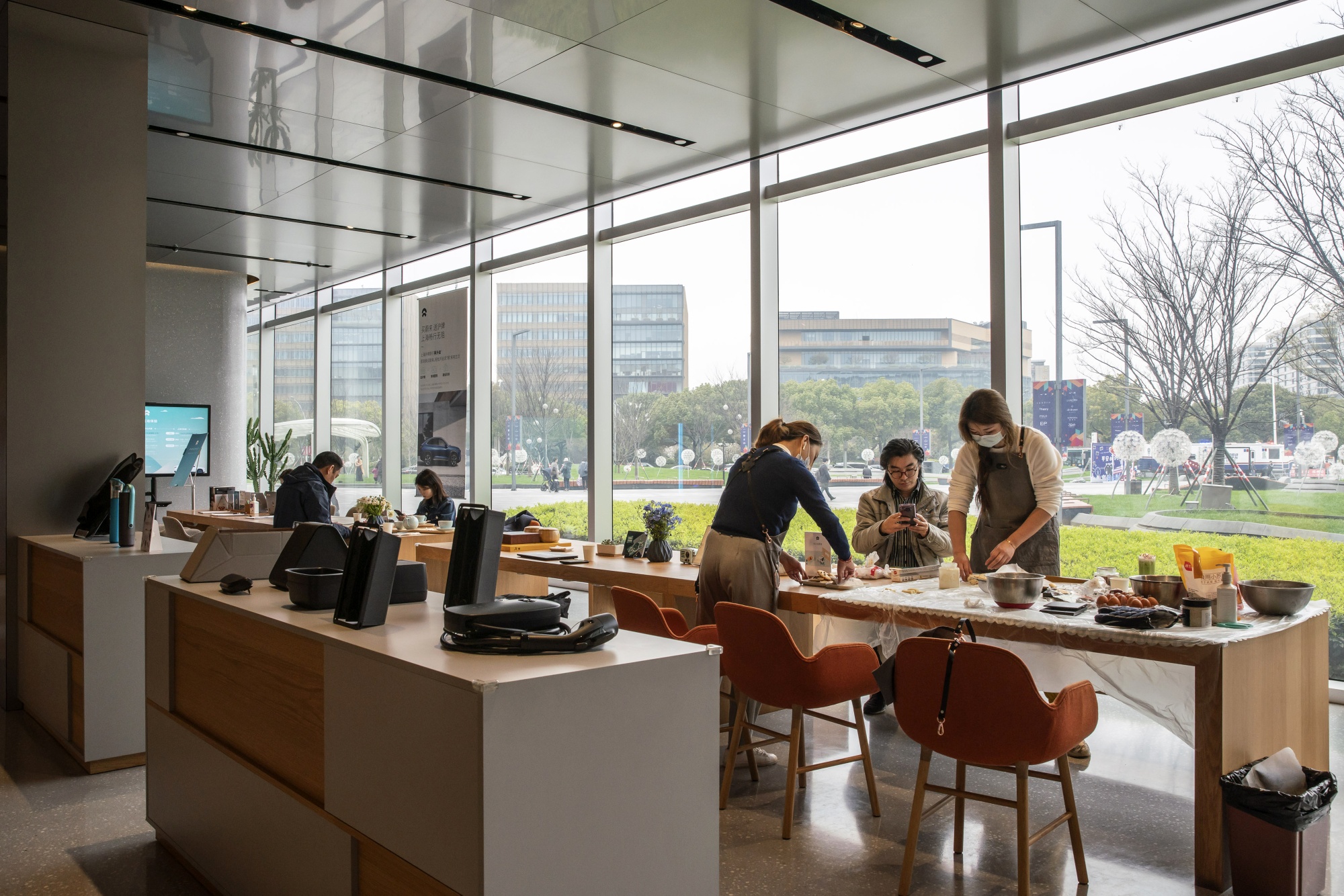 顾客在上海蔚来之家制作糕点并放松身心。摄影师:沈其来/彭博社一位40多岁的女性,今年初加入了一家中国电动汽车制造商,此前在一家美国汽车制造商工作了十多年,她曾以为会一直工作到退休。除了更好的薪水和股票期权,参与更具活力的工作场所文化并帮助公司建设成功未来给了她很多工作满足感,即使她加班加点,她告诉我。