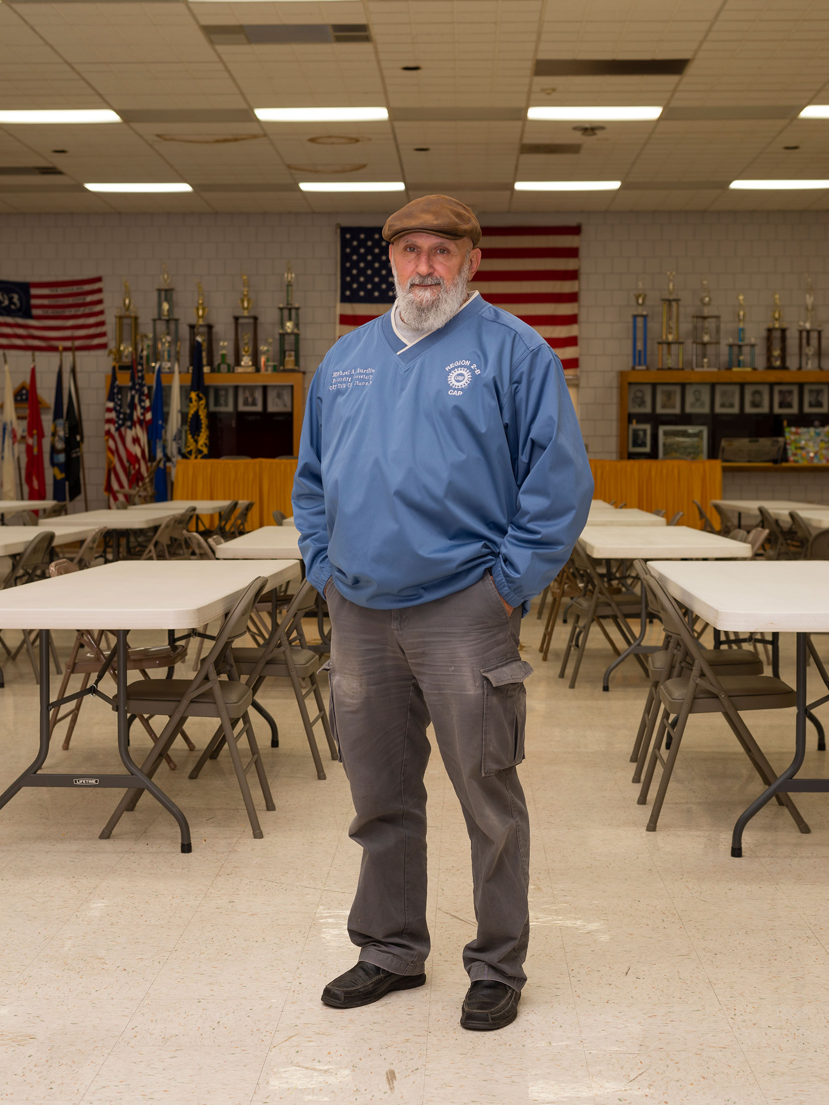 迈克·奥里利奥在UAW 1112地方工会大厅。摄影师:约翰-大卫·理查森,彭博商业周刊走廊尽头是迈克·奥里利奥的办公室,他是1112地方工会的记录秘书,于1970年19岁时开始担任车身修理技术员。他的墙上贴满了一生的UAW纪念品。政治竞选按钮——奥巴马、克里、克林顿、蒙代尔等数百个——小心翼翼地贴在拥挤的布告板上。一张奥里利奥和希拉里·克林顿的合影挂在他办公桌后面。