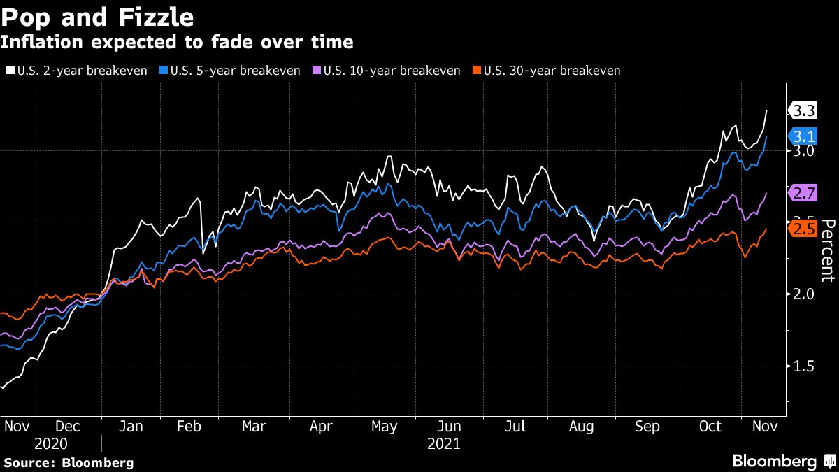 值得注意的是,十月份的消费者价格指数显示,通胀正在从重启相关类别向更广泛的领域扩散 -- 这一趋势预计只会 加剧。幸运的是,花旗集团有一些 安抚的话。尽管承认这一观点与华尔街当前大多数的忧虑不同步,该银行的策略师写道,核心消费者价格指数应在2022年2月达到峰值,之后再经过几个月的上涨。