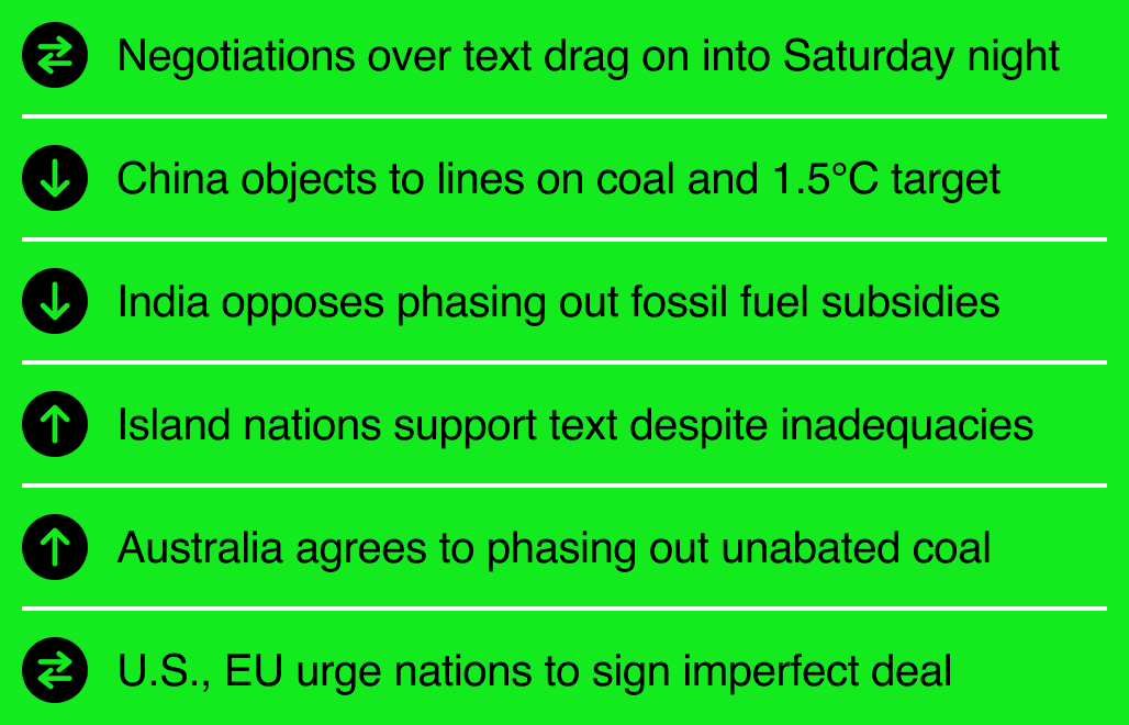 中国和印度,全球第一和第三大排放国,抨击了本周活动人士谨慎乐观地依赖的所有内容。他们最主要的反对意见是:呼吁淘汰煤炭和化石燃料补贴,以及关于遏制气温上升至1.5摄氏度所需的措辞。印度还反对明年即敦促各国加强其气候计划的举措。如果这些条款被削弱,将出现一份较弱的文件。