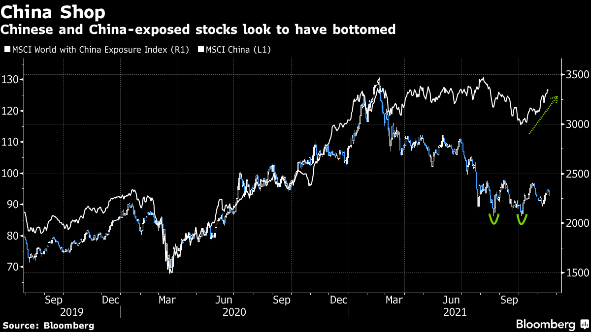 考虑购买中国陷入困境的股市的潜在买家可以从国际同行传递的信息中稍微得到一些安慰。具有对中国最高销售曝光度的发达市场股票构成的MSCI世界指数自10月初低点上涨约12%,看起来将重新测试8月份的历史最高点。相比之下,MSCI中国仍然陷入熊市,比2月份的年度高点低约27%。关于中国的熊市情况众所周知:政府打击私营企业、经济放缓和房地产危机。交易员们面临的问题是最坏的时期是否已经过去。