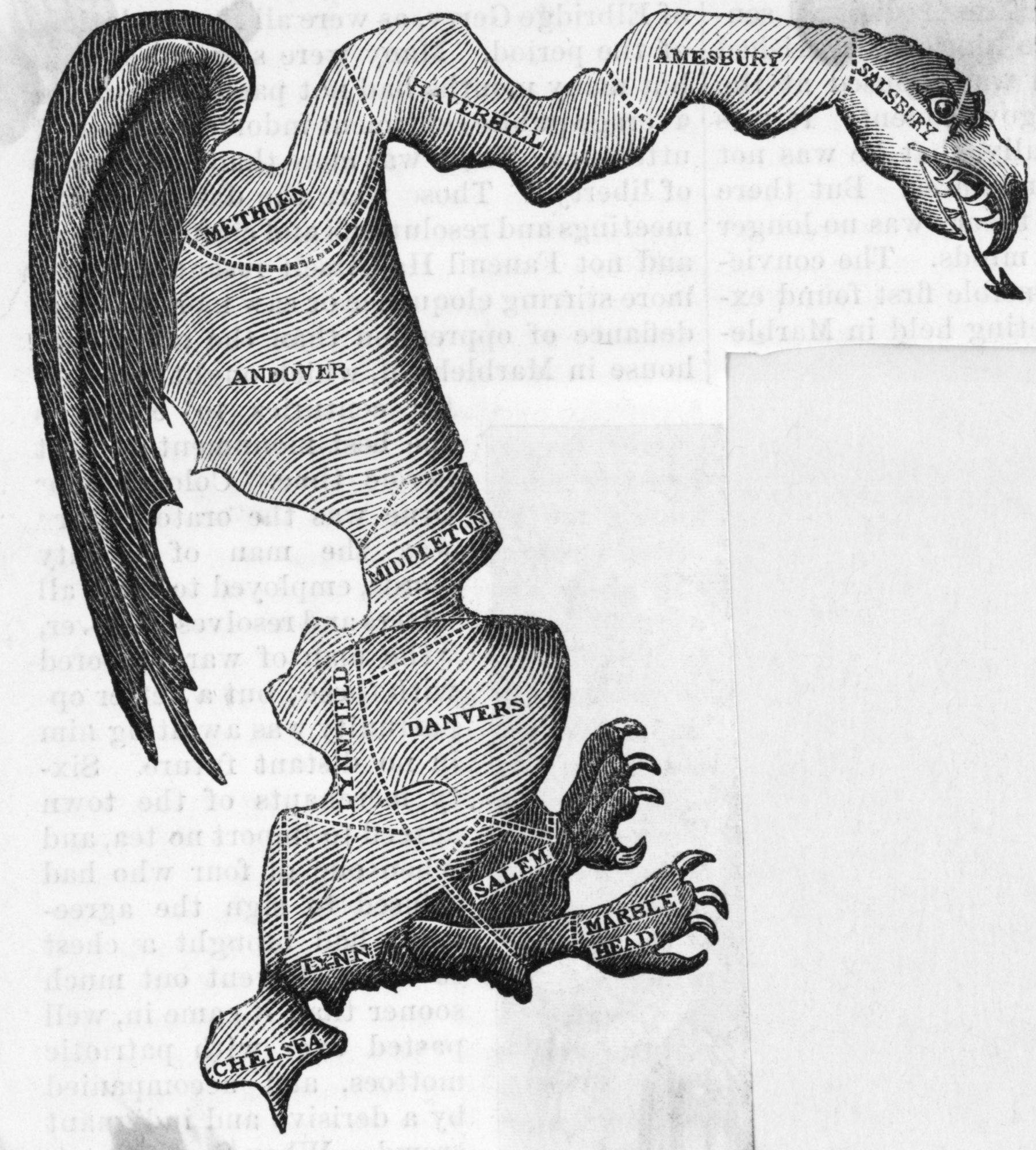 术语“选区划分”源自吉尔伯特·斯图尔特(Gilbert Stuart)的这幅漫画,描绘了一个被扭曲到超乎理智的马萨诸塞州选区。斯图尔特认为该选区的形状像一只蝾螈,但向他展示原始地图的朋友称其为“盖瑞曼德”(Gerry-mander),以马萨诸塞州州长埃尔布里奇·盖瑞(Elbridge Gerry)的名字命名,他批准重新调整选区线以获取政治优势。摄影师:贝特曼(Bettmann)