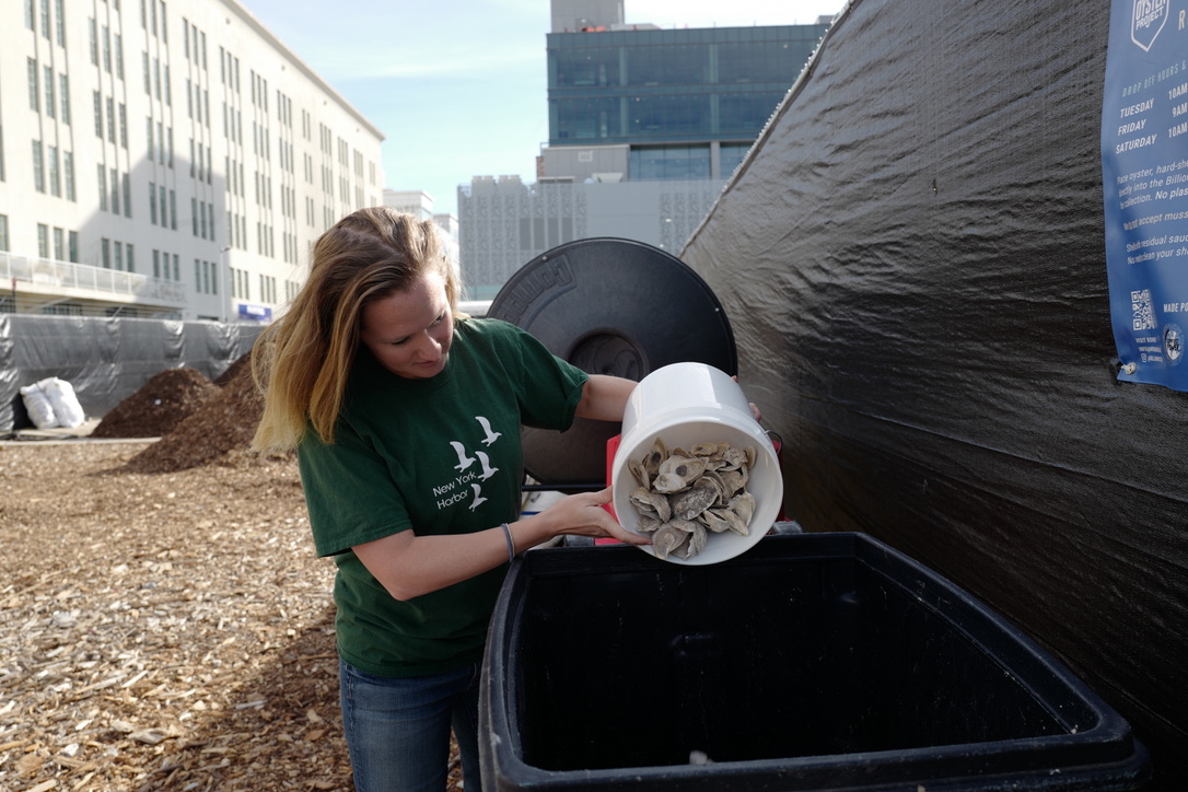 Helene Hetrick of the Billion Oyster Project unloads a bin of cleaned shells in Brooklyn, New York.摄影师:Catherine Blewer/Bloomberg CityLab/Bloomberg