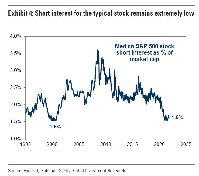 健康的市场往往由多种观点和立场组成,但科斯汀也指出,自2000年科技泡沫以来,平均股票的空头利率已降至历史最低水平,从2020年初的市值的2.2%下降到目前的1.5%。对冲基金今年已多次被零售狂热所伤,似乎已经采取了“如果你不能打败他们,就加入他们”的交易方式。这意味着当出现障碍时 — 正如我们周一看到的那样 — 出口可能会变得拥挤。
