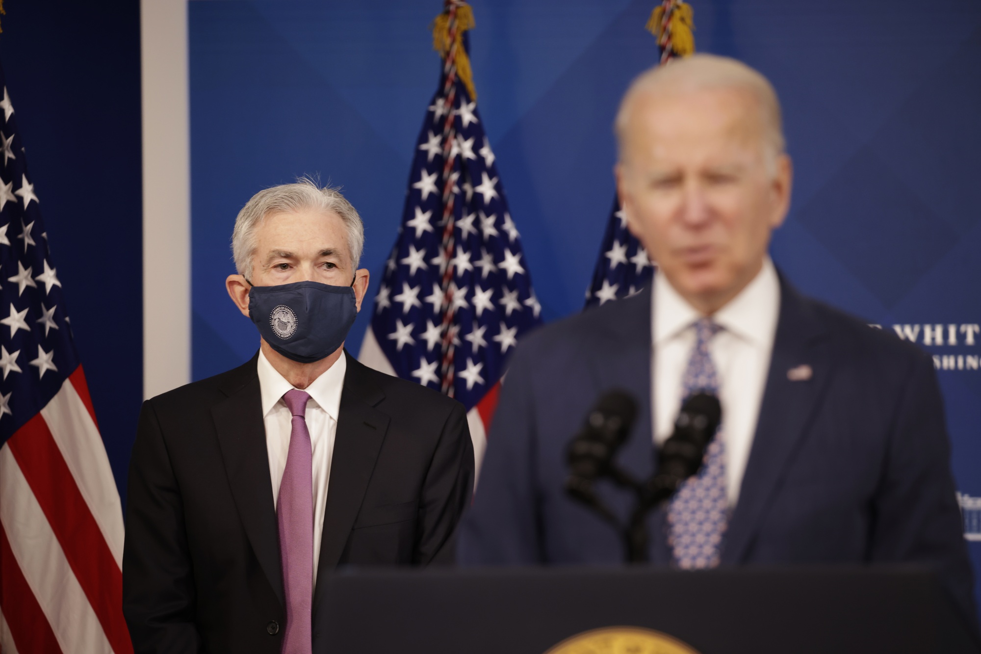 杰罗姆·鲍威尔,美国联邦储备委员会主席,听着美国总统乔·拜登讲话。