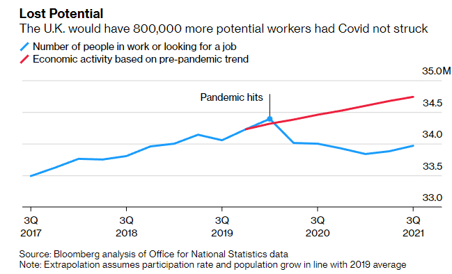 这些数据突显了参与就业市场的人数比例发生了戏剧性变化。这种变化的规模远远超过了据估计在危机中离开英国的17万移民人数,凸显了劳动力短缺正在推高工资和物价。