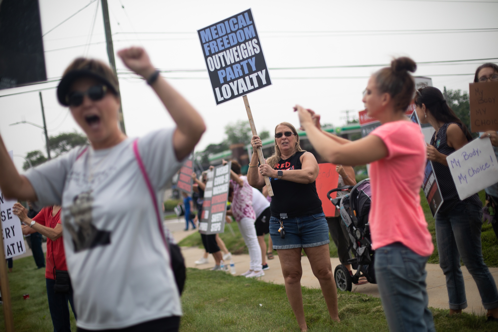 示威者聚集在密歇根州利沃尼亚市的圣玛丽慈善利沃尼亚医院前,抗议要求医护人员接种强制性Covid-19疫苗,时间是7月24日。现在,该州的医疗系统正遭受围攻,因为德尔塔变种正在肆虐该州未接种疫苗的人口。