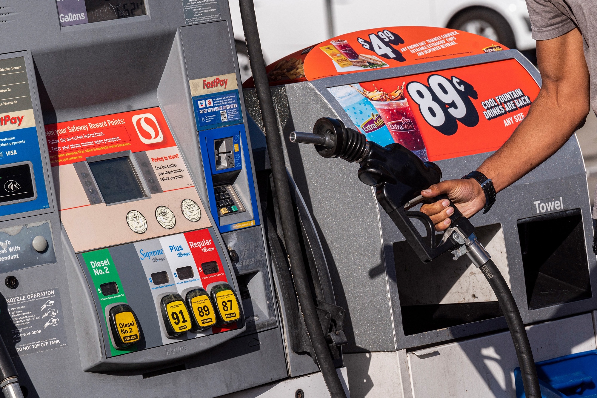 一个顾客在加利福尼亚州旧金山的加油站更换燃油泵喷嘴。