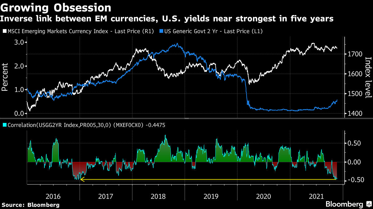 Jon Turek 在 Cheap Convexity 指出,所有这些情况的共同线索当然是美联储,现在普遍预计明年将开始加息。正如他所说,美国央行的风险分布现在牢固地倾向于通胀/加息一侧。你要么会得到目前已经预示的加息,要么可能会得到尚未出现的加息。或者正如他所说:“美联储明年的结果分布要么是鸽派加息,要么是鹰派加息,这对新兴市场央行来说是一个棘手的背景。正如我的朋友 MacroKurd 喜欢说的,当美国利率上升时,事情就会出问题。这对新兴市场来说总是正确的。”