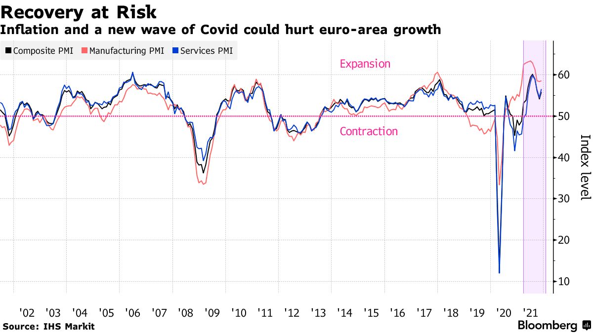 *欧元区的商业活动意外加快,尽管该地区的复苏**面临来自新一波Covid-19感染和“创纪录的通胀压力”的阻力。*根据采购经理的调查,IHS Markit的综合采购经理人指数从10月的54.2上升到11月的55.8。尽管这违背了分析师调查中预测该指数将下降的中位数估计,但报告称,这仍然表明了2021年第四季度经济增长疲软。