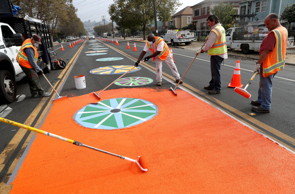 工人们在2019年为了行人和自行车骑行者的安全,在加利福尼亚州东奥克兰市的第90大道上涂抹橙色涂料,作为一项铺路和重新设计项目的一部分。