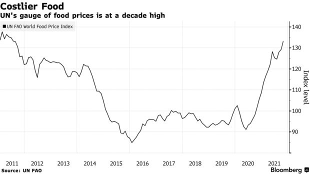 食品价格可能会因消费者囤货、能源和运输价格上涨、恶劣天气以及美元走强而保持接近纪录高位,据荷兰合作银行称。“这一领域的通胀几乎肯定不仅仅是‘暂时的’,”卡洛斯·梅拉领导的分析师们表示。