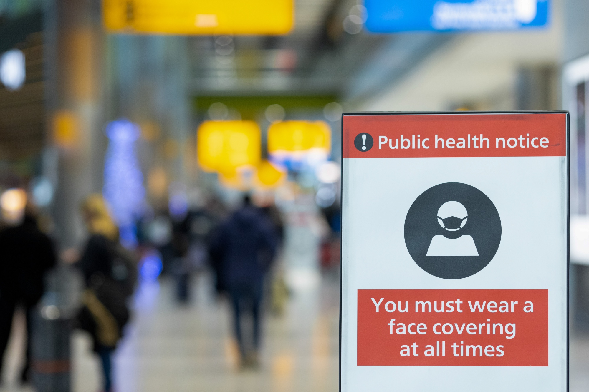 伦敦希思罗机场的新冠病毒安全标志。摄影师:Jason Alden/Bloomberg点击这里查看我们彭博政治网站,并与他人分享此新闻简报。他们也可以在这里注册。