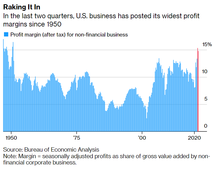 根据最新的美国数据显示,在华盛顿已经出现的新政治分歧中,成本上涨和工资增长几乎没有损害美国企业——事实上,利润率已经达到自1950年以来的最高水平。