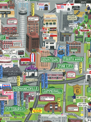 放大地图,你会发现许多其他文化参考和地标:“Toilet Tisha”,这是Outkast一首深受喜爱的歌曲的引用,是一个站在长久以来的Greenbriar Mall附近的女人;“Bankhead”,南部嘻哈最具标志性舞蹈之一的发源地;以及“Freaknik”,在1990年代是嘻哈爱好者、舞者和怪人们的热门年度聚会。