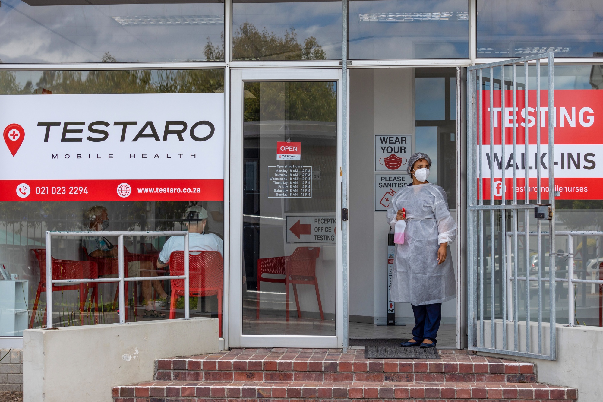 南非宣布发现新变种,后来被命名为奥密克戎,于11月25日开始出现病例激增,该变种在全球蔓延。上图,一名卫生工作者在12月2日在开普敦的一个检测点入口等待手部消毒剂。