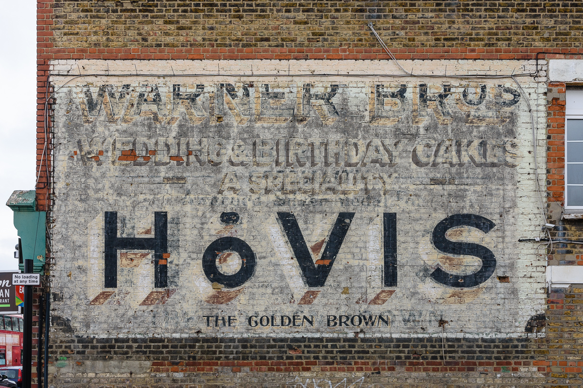 仔细观察伦敦老街两侧的建筑物,很快你就会看到一个:一个古老的涂鸦招牌,曾经鲜艳抢眼,现在已经褪色进入砖石之中,宣传的企业或产品名称剥落而微弱。